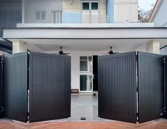 - Características: As folhas do portão se dobram ao longo de dobradiças, ocupando um espaço reduzido na lateral quando abertas.